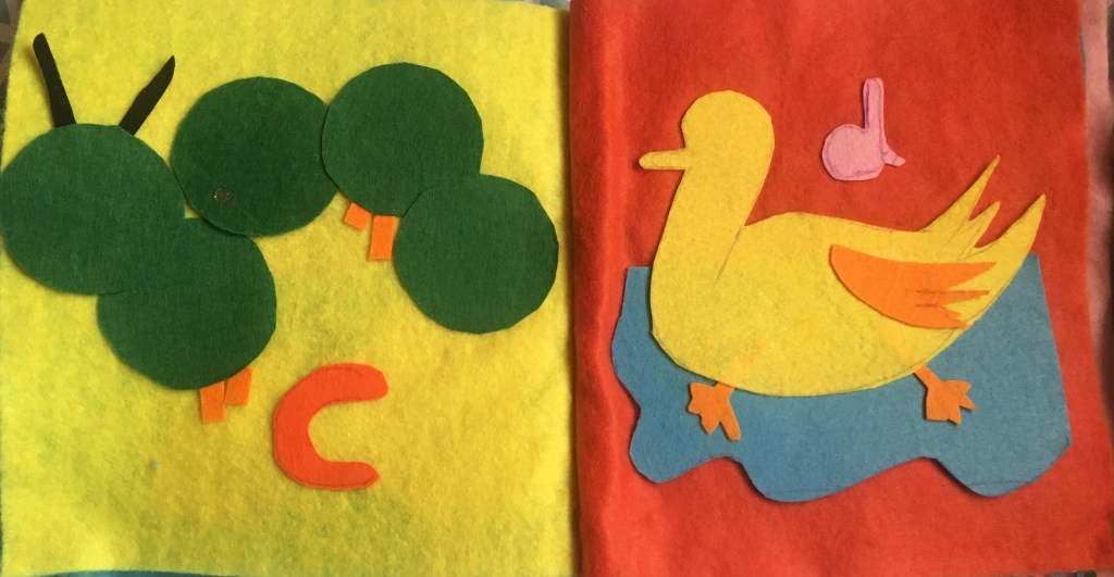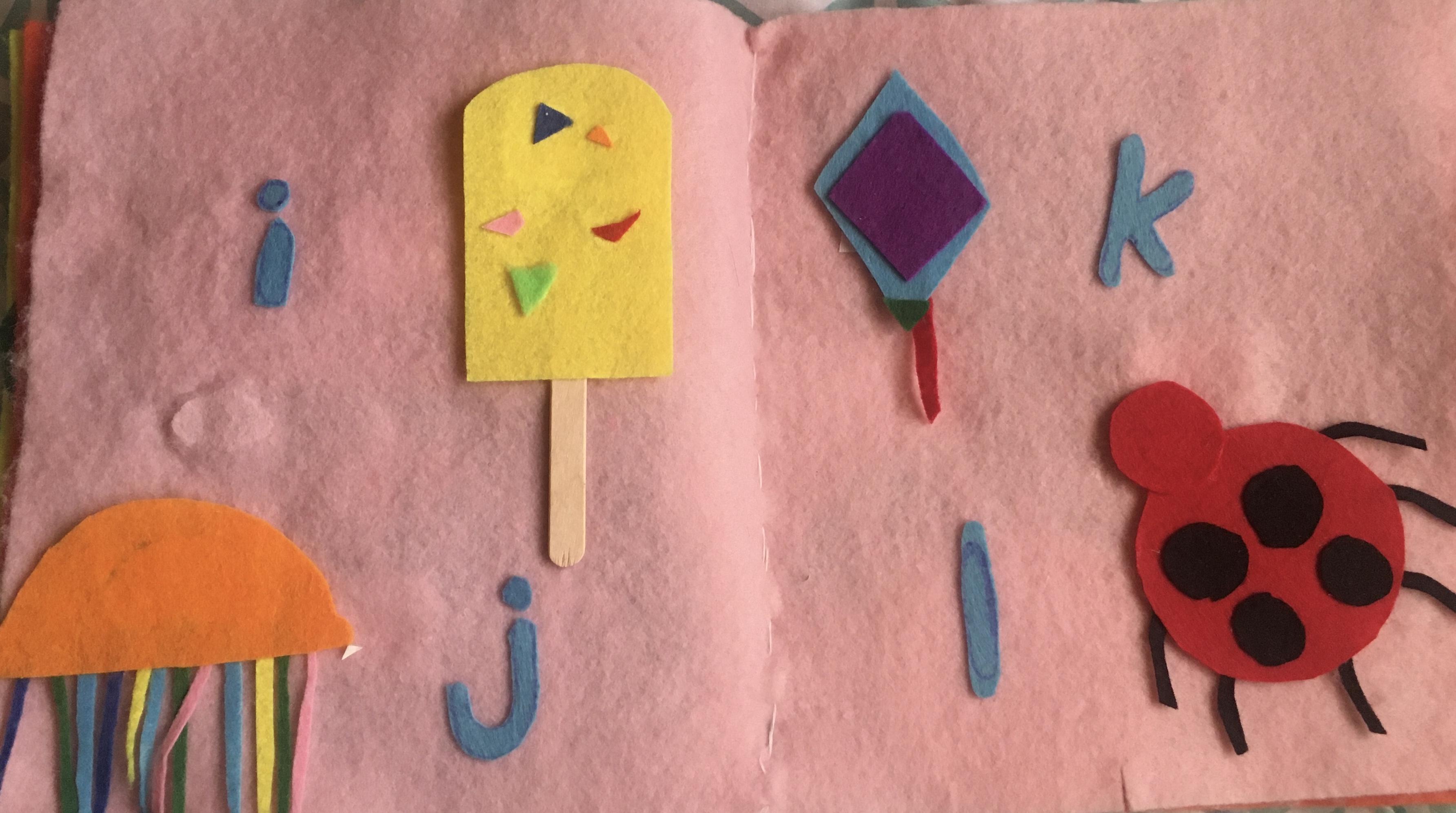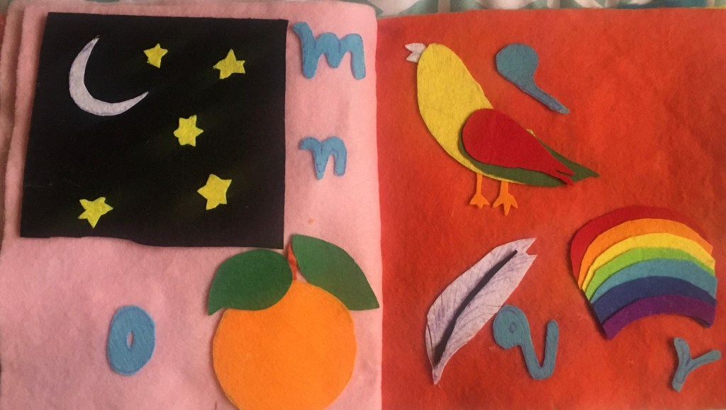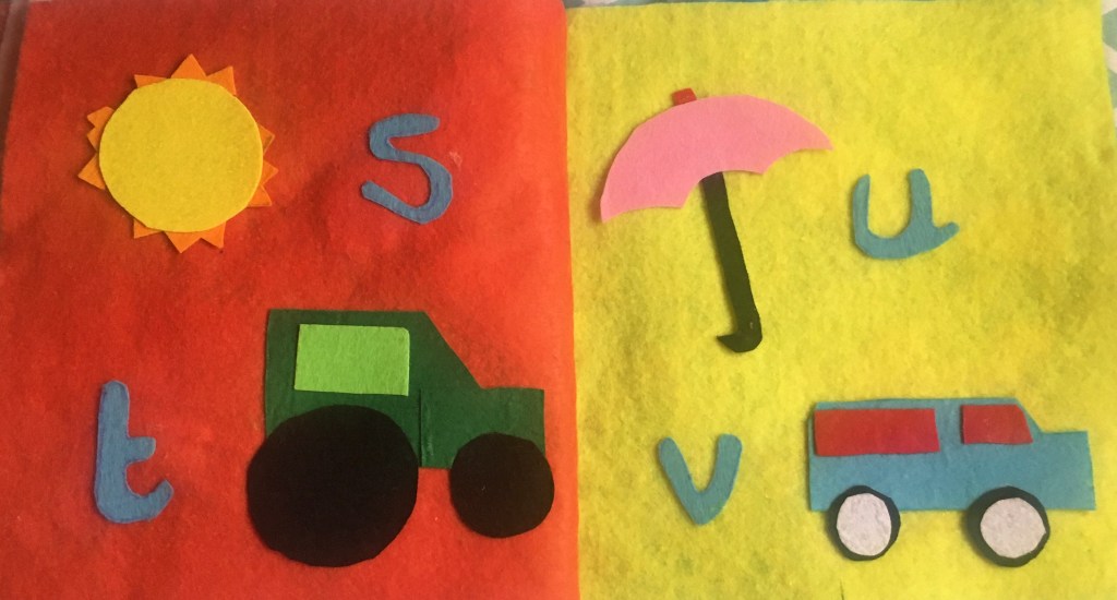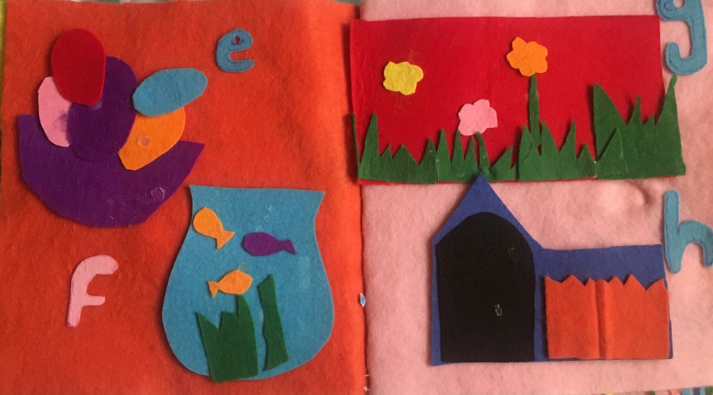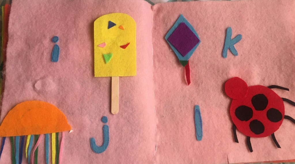 Talking about crafts we made this felt alphabet activity craft book to enrich our english letter learning journey. This has resulted as a nice activity to reinforce letter recognition and what each alphabet calls for. You need simple things velcro, thin and thick felt paper sheets in multi-colour , craft glue , needle and thread to sew and a pair of scissor. I am not listing the method to make this as all the felt books are quite similar in terms of crafting and there is a lot of guidance material as how to do it.