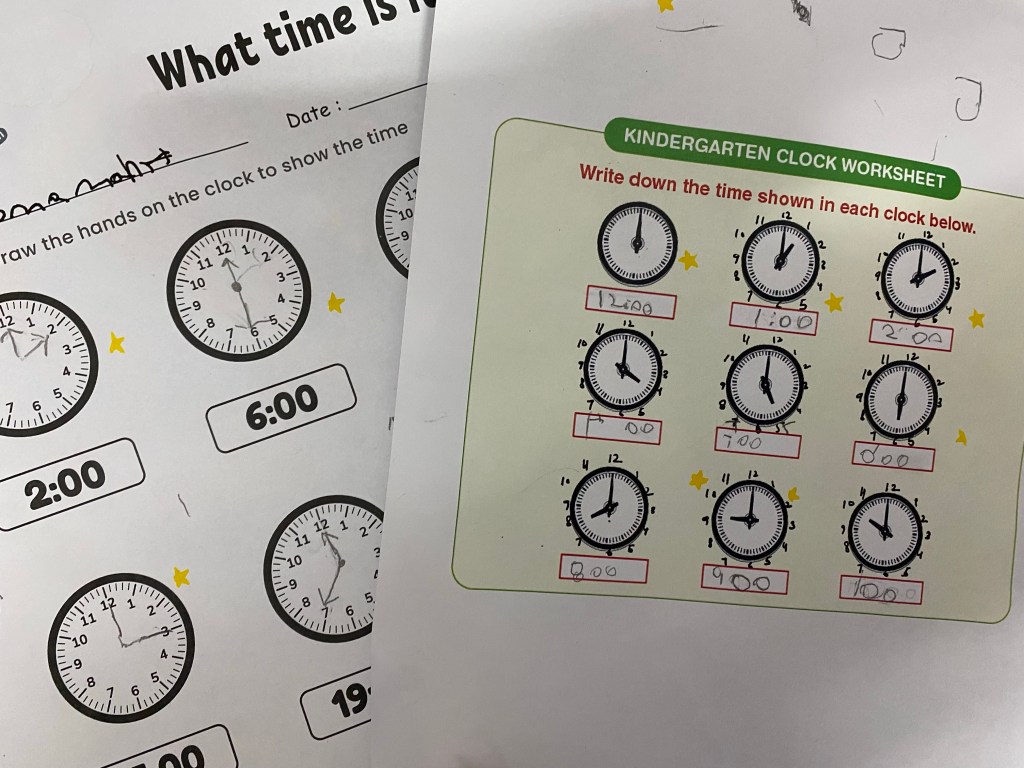 And just like that it was hint enough for me to decipher our homeed topic of the day. We talked about the clock , going in more detail of the number of hours. We did learning of the hour and the minute – hands, reading whole hours by making the clock with certain times of the day and night and also writing the time with that shown on the clock.