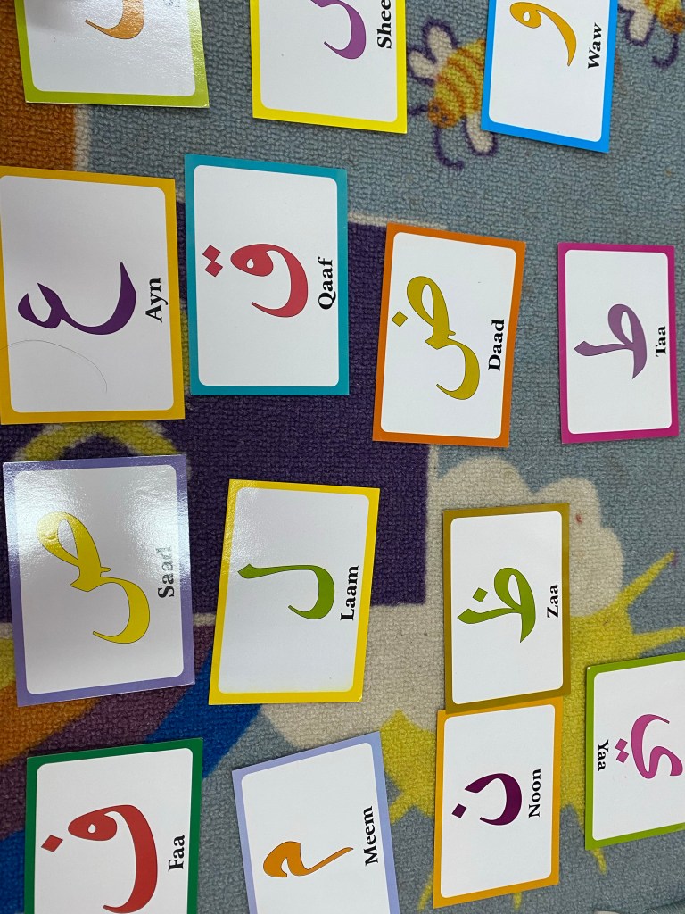 For reading, we recently started stage 3 of the songbirds series. I randomly ask the kids to point to a certain word that I say and they correctly respond, masha Allah.