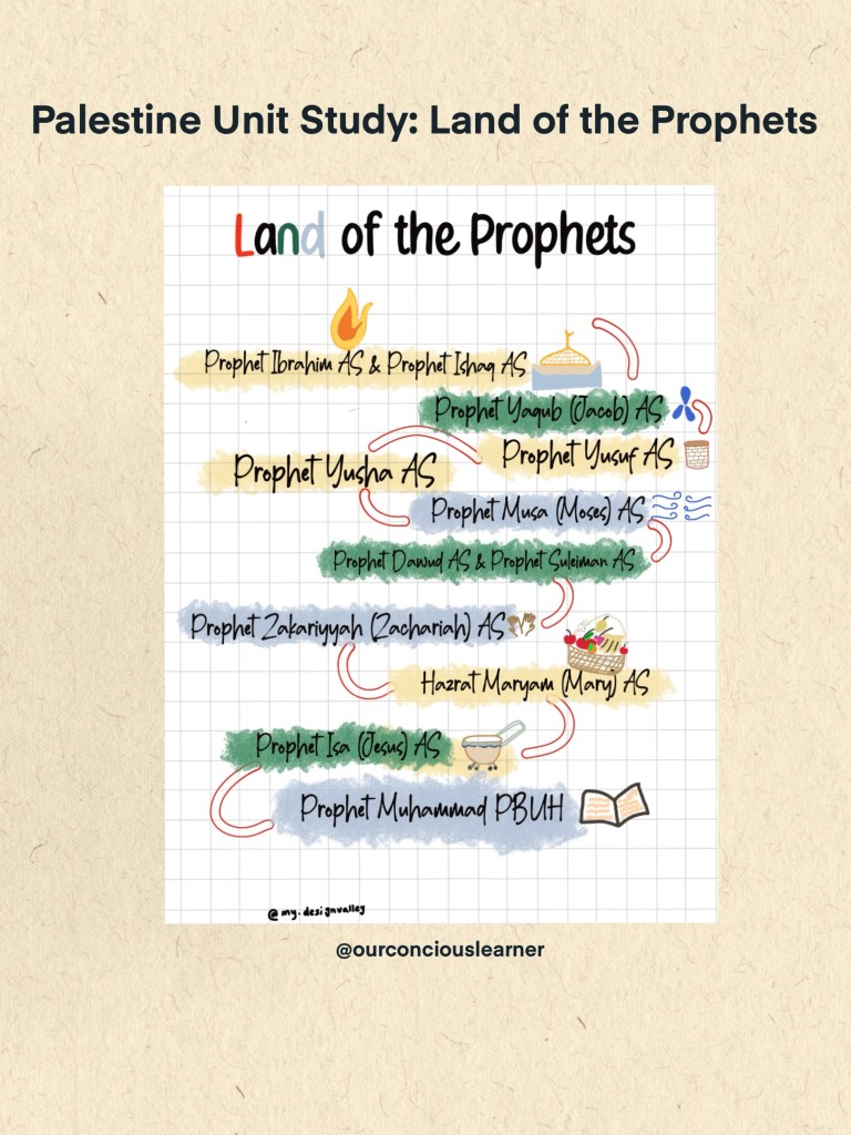 The land of the prophet educational resource is created for amplifying the learning of the land of Palestine. It is a one page downloadable PDF document and sites a flowchart for the relevant prophets of this land.