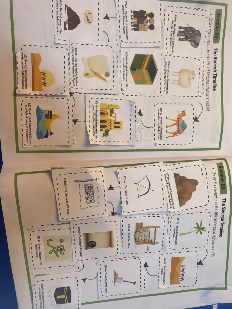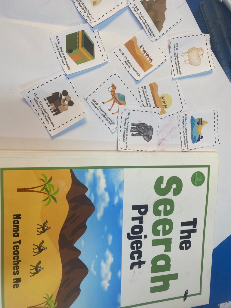 How could we not touch the beautiful seerah? Within seerah, we are still amidst the Meccan period, so this came appropriately linking the Time topic with making and understanding the consecutive events that had unfolded in the life of Prophet Muhammad PBUH. It was abit of work as we have not covered the seerah fully in depth and so I helped O in revisiting the older topics we had done the previous year and stories that we have read along and read aloud to put this in order.
