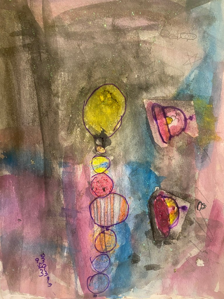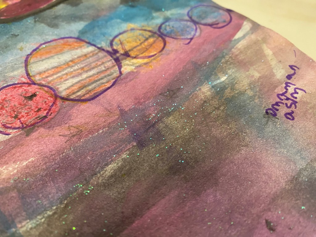 There are celestial bodies in a glittery cosmos and two spaceships who ‘meet’ in space and become friends. Dont ignore the tiny details she has made on her own Masha Allah. The intricacies of the planets and the detailing in a colorful mesmerizing space.