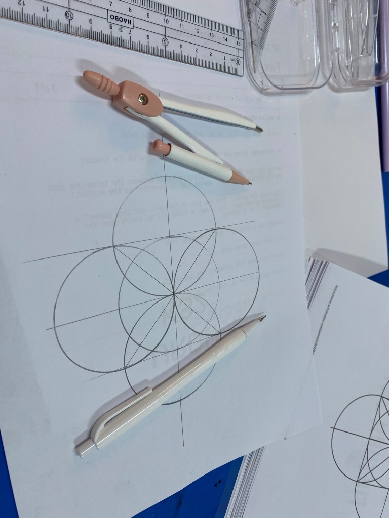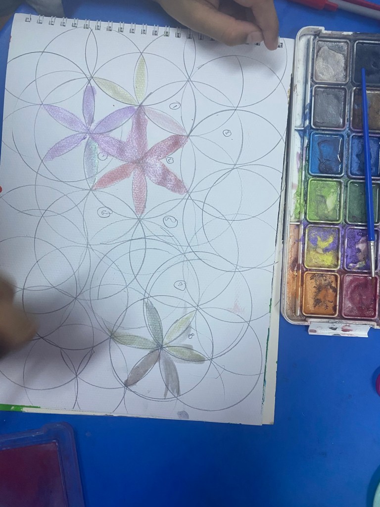 Working on compass require hand eye coordination and dexterity for little kids. The creation of circles was a bit challenging for O. Alhamdulillah she got through it.